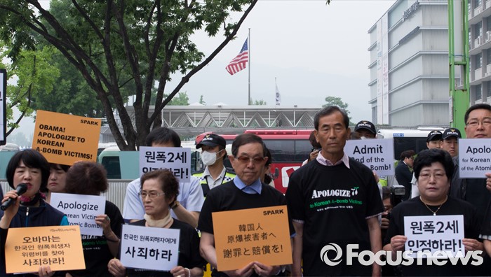 (서울=포커스뉴스) 26일 오전 서울 종로구 광화문 KT 앞에서 한국 원폭피해자와 시민사회단체가 오바마 미국 대통령의 한국 원폭 피해자들에 대한 공식 인정과 조사 및 사죄 촉구 기자회견을 하고 있다.