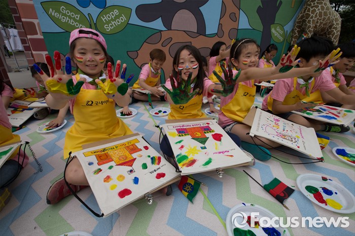 (서울=포커스뉴스) 26일 오전 서울 광진구 어린이대공원에서 열린 굿네이버스 '아프리카 희망학교 체험전'에서 초등학교 학생들이 아프리카에 보낼 가방을 완성한 후 기념촬영을 하고 있다.