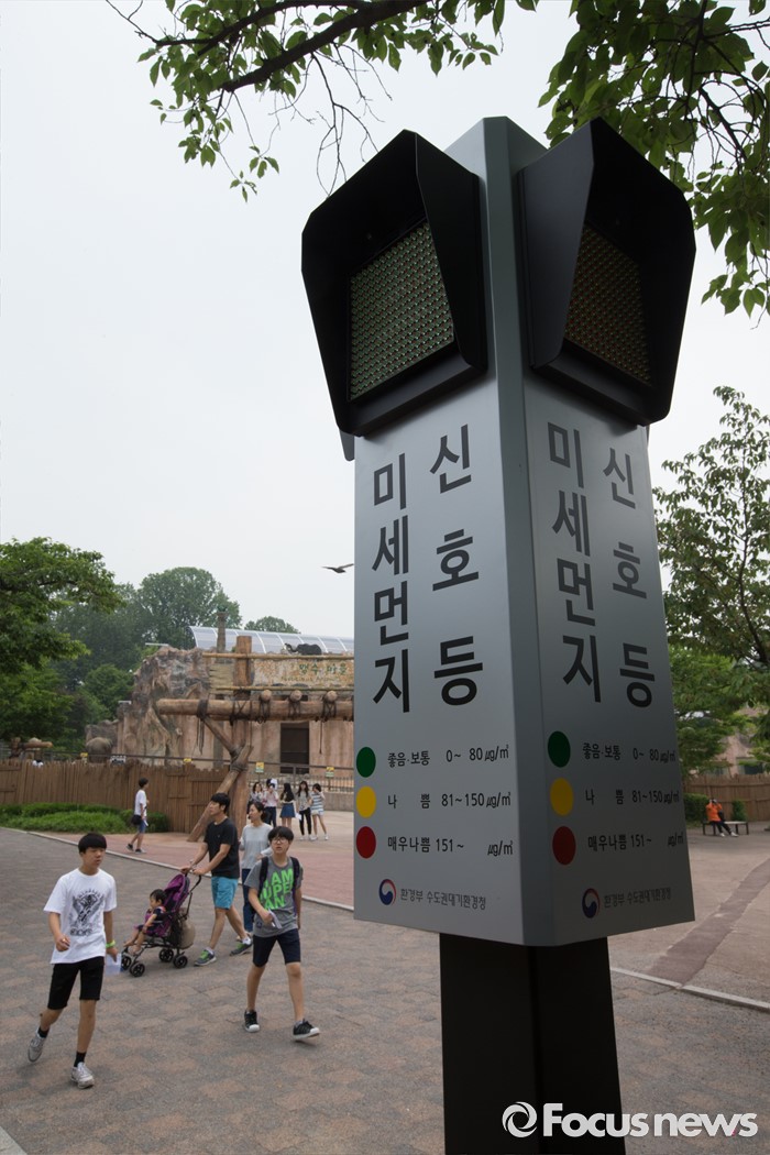 (서울=포커스뉴스) 26일 오전 서울 광진구 어린이대공원에 설치된 미세먼지 신호등에 나쁨 수준인 노란색 불이 켜져 있다.