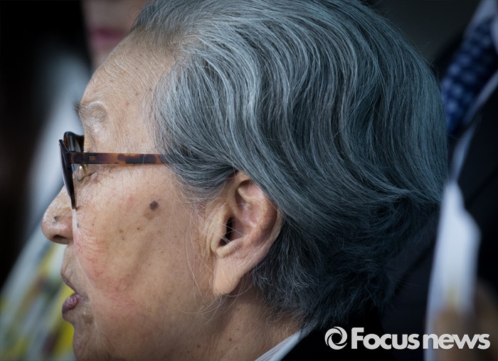 (서울=포커스뉴스) 26일 오전 서울 여의도 국회 정론관에서 홍익표, 이인영 더불어민주당 의원과 윤미향 한국정신대문제대책협의회 상임대표, 위안부 피해자 김복동 할머니 등이 한일 일본군 '위안부' 합의 무효 및 재협상을 위한 20대 국회의 역할 촉구 기자회견을 하고 있다.
