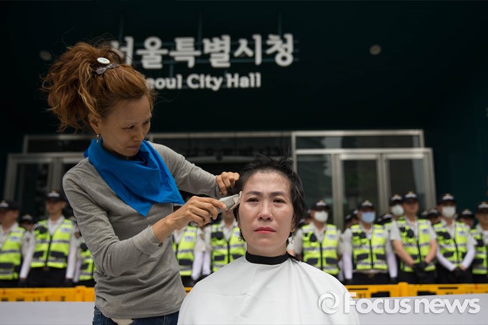 (서울=포커스뉴스) 26일 오전 서울시청 정문앞에서 전국장애인 부모연대와 서울특수학교학부모협의회원들이 발달장애인 정책 수립을 촉구하며 삭발식을 하고 있다.