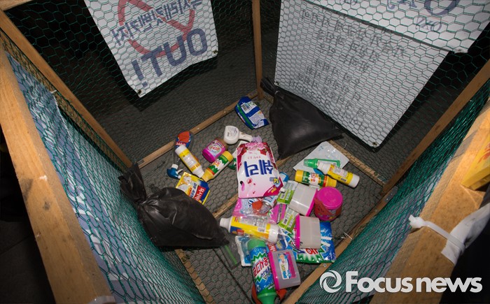 (서울=포커스뉴스) 26일 오후 서울 광화문광장에 마련된 성공회대 학생모임과 청년참여연대가 제작한 '옥시레킷벤키저 제품 수거함'에 옥시 제품들이 버려져 있다.