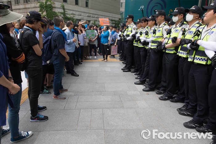 (서울=포커스뉴스) 26일 오전 서울시청 정문앞에서 전국장애인 부모연대와 서울특수학교학부모협의회원들이 발달장애인 정책 수립을 촉구하며 삭발식을 한 뒤 항의의 의미로 머리카락을 서울시에 전달하려고 하자 경찰병력이 막아서고 있다.