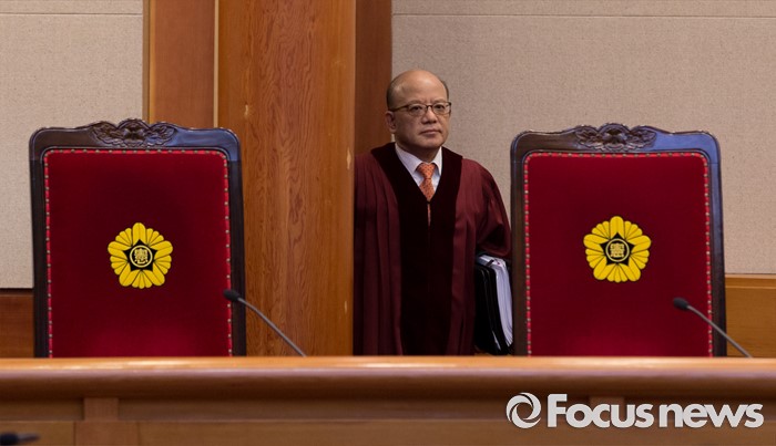 (서울=포커스뉴스) 26일 오후 서울 종로구 헌법재판소 대심판정에서 박한철 헌법재판소장이 국회선진화법 권한쟁의 심판 선고 및 통합진보당 해산결정 재심 선고를 위해 입장하고 있다.