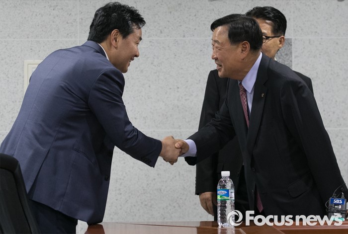 (서울=포커스뉴스) 김관영(왼쪽) 국민의당 원내수석부대표가 26일 오후 서울 여의도 국회 의원회관에서 이희범 평창동계올림픽 조직위원장과 만나 박지원 원내대표와의 면담에 앞서 인사하고 있다.