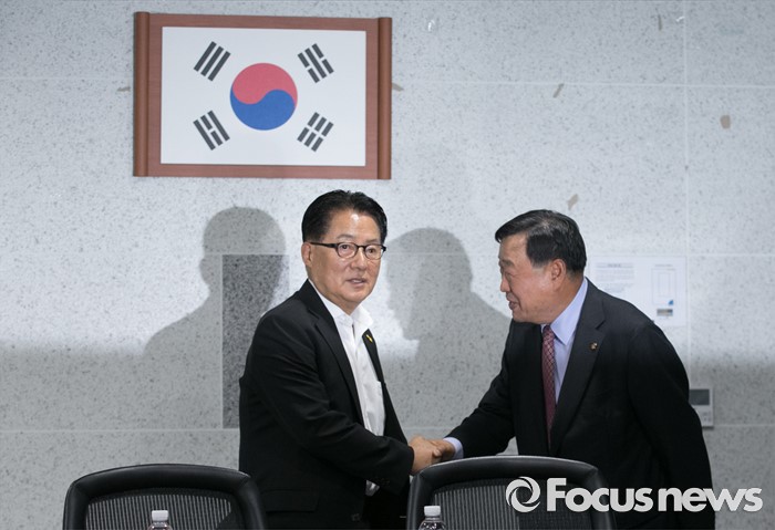 (서울=포커스뉴스) 박지원(왼쪽) 국민의당 원내대표가 26일 오후 서울 여의도 국회 의원회관에서 이희범 평창동계올림픽 조직위원장과 만나 면담에 앞서 인사하고 있다.