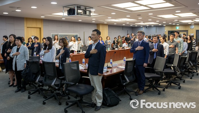 (서울=포커스뉴스) 26일 오후 서울 여의도 국회의원회관에서 열린 '강남역 여성 살인사건의 원인과 대책 긴급 토론회'에서 참석자들이 국민의례를 하고 있다.