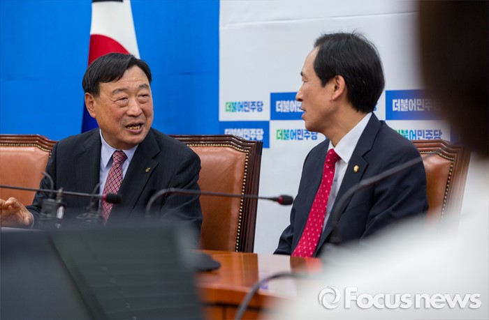 (서울=포커스뉴스) 이희범(왼쪽) 평창동계올림픽조직위원장이 26일 오후 서울 여의도 국회에서 우상호 더불어민주당 원내대표를 예방하고 있다.