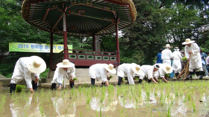 이날 행사는 당일 오전 11시에 입장하는 창덕궁 후원 특별 관람객에 한해 무료로 참여할 수 있다. 모내기 행사 외에도 농촌진흥청 지원으로 전시된 다양한 벼 품종과 쌀을 이용한 각종 가공식품을 만날 수 있다.지난 2015년 창덕궁 옥류천 청의정(淸漪亭)에서 열린 모내기 행사 모습.<사진제공=문화재청>