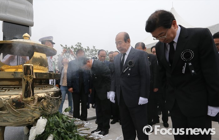 (서울=포커스뉴스)26일 오후 서울 동작구 국립현충원에서 열린 고 김영삼 전 대통령 묘비 제막식에서 김수한 전 국회의장 등 원로 정치인들이헌화 및 분향을 하고 있다.