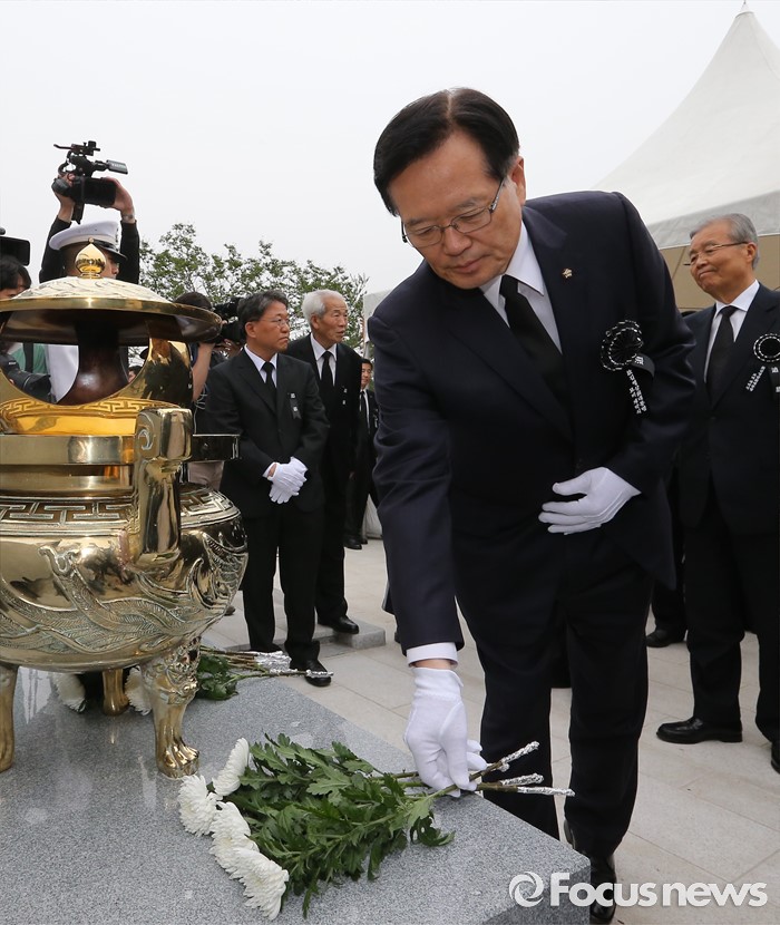 (서울=포커스뉴스) 26일 오후 서울 동작구 국립현충원에서 열린 고 김영삼 전 대통령 묘비 제막식에서 정의화 국회의장 및 정치인들이 헌화 및 분향을 하고 있다.