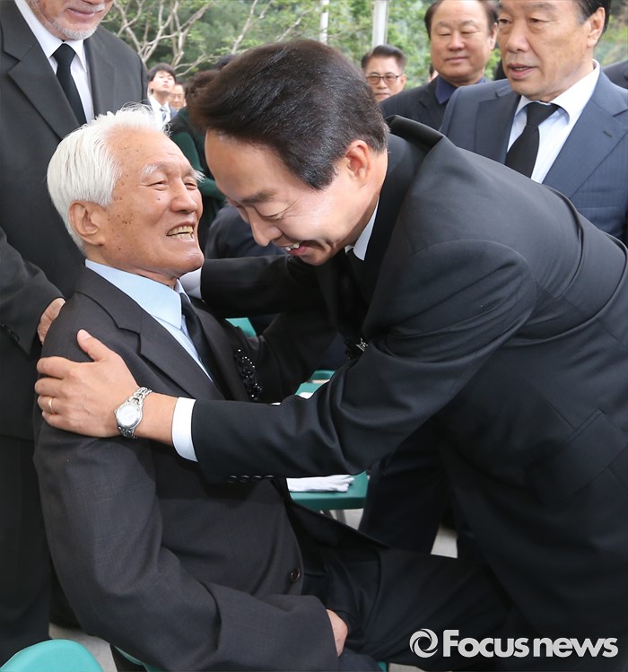 (서울=포커스뉴스) 26일 오후 서울 동작구 국립현충원에서 열린 고 김영삼 전 대통령 묘비 제막식에서 김 전 대통령의 차남 김현철 교수가최형우 전 의원과 인사를 나누고 있다.