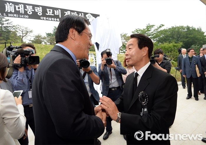 (서울=포커스뉴스) 새누리당 정진석(왼쪽) 원내대표가 26일 오후 서울 동작구 국립현충원에서 열린 故 김영삼 전 대통령 묘비 제막식에 참석해 차남 김현철씨와 인사를 하고 있다.