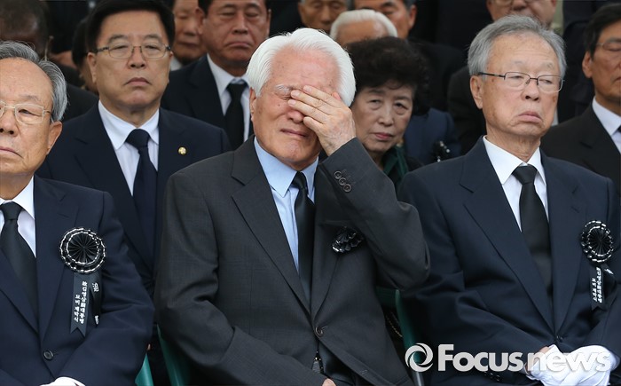 (서울=포커스뉴스) 26일 오후 서울 동작구 국립현충원에서 열린 고 김영삼 전 대통령 묘비 제막식에서 최형우 전 의원이 눈물을 흘리고 있다.