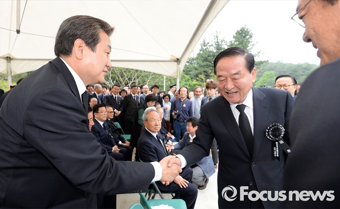 (서울=포커스뉴스) 새누리당 김무성(왼쪽) 전 대표와 서청원 의원이 26일 오후 서울 동작구 국립현충원에서 열린 故 김영삼 전 대통령 묘비 제막식에 참석해 악수를 하고 있다.