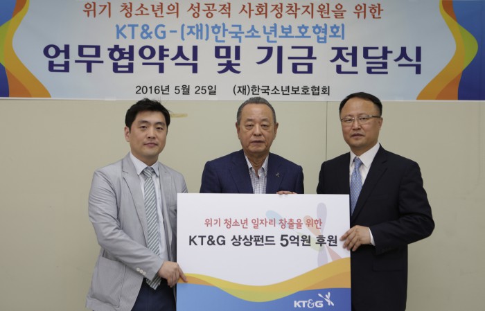 (서울=포커스뉴스) KT&G 임직원들이 26일 한국소년보호협회에 5억원을 전달했다. 위기청소년들의 창업을 지원해 안정적으로 사회에 정착할 수 있도록 돕기 위해서다.