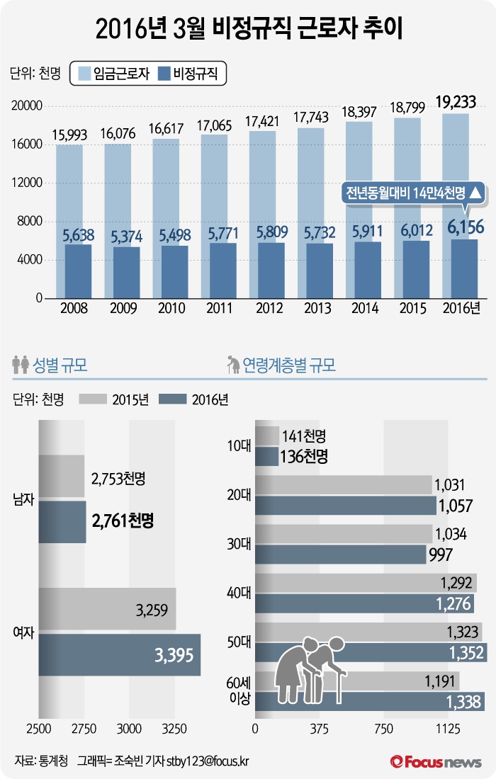(서울=포커스뉴스) 26일 통계청이 공개한 ‘2016년 3월 경제활동인구조사 근로형태별 부가조사 결과’에 따르면 3월 기준 비정규직 근로자는 615만6000명으로 전년동월대비 14만4000명 급증했다.