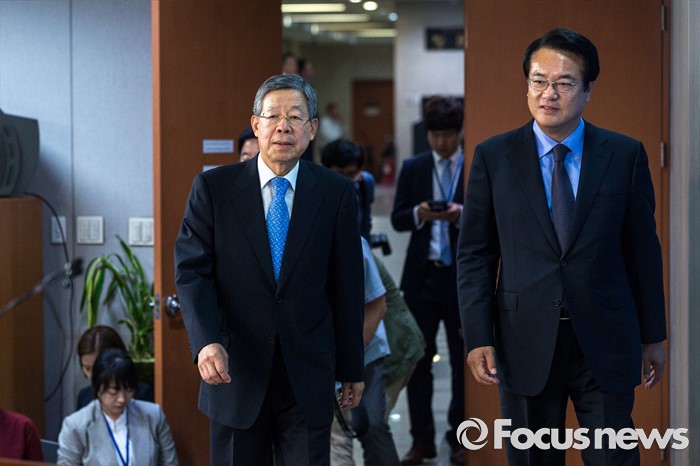 (서울=포커스뉴스) 새누리당 임시지도부인 혁신비상대책위원회 위원장에 내정된 김희옥(왼쪽) 전 정부공직자윤리위원장과 정진석 새누리당 원내대표가 26일 오후 서울 여의도 국회에서 혁신비대위 계획을 발표 하기 위해 기자회견장으로 들어서고 있다.