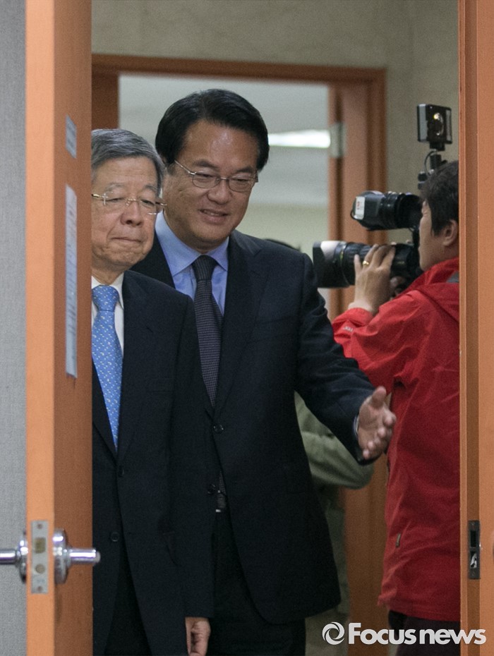 (서울=포커스뉴스) 새누리당 혁신비대위원장에 내정된 김희옥(왼쪽) 전 동국대 총장과 정진석 원내대표가 26일 오후 서울 여의도 국회 정론관에서 기자회견을 위해 입장하고 있다.