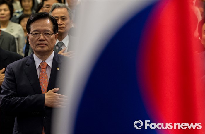 (서울=포커스뉴스) 26일 오후 서울 여의도 국회 헌정기념관에서 열린 '새한국의 비전' 창립 기념식에 참석한 정의화 국회의장이 국민의례를 하고 있다.