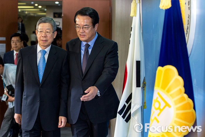 (서울=포커스뉴스) 새누리당 임시지도부인 혁신비상대책위원회 위원장에 내정된 김희옥(왼쪽) 전 정부공직자윤리위원장과 정진석 새누리당 원내대표가 26일 오후 서울 여의도 국회에서 혁신비대위 계획을 발표 하기 위해 기자회견장으로 들어서고 있다.