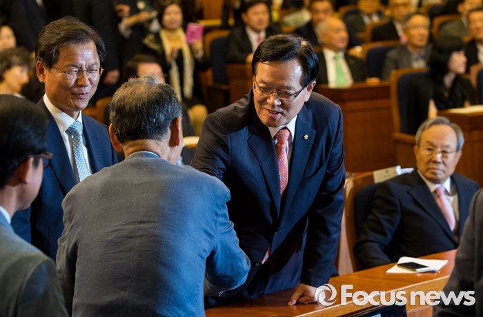 (서울=포커스뉴스) 26일 오후 서울 여의도 국회 헌정기념관에서 열린 '새한국의 비전' 창립 기념식에 참석한 정의화 국회의장이 참석자들과 악수하고 있다.