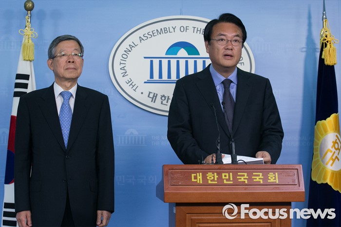 (서울=포커스뉴스) 새누리당 혁신비대위원장에 내정된 김희옥(왼쪽) 전 동국대 총장과 정진석 원내대표가 26일 오후 서울 여의도 국회 정론관에서 기자회견을 하고 있다.