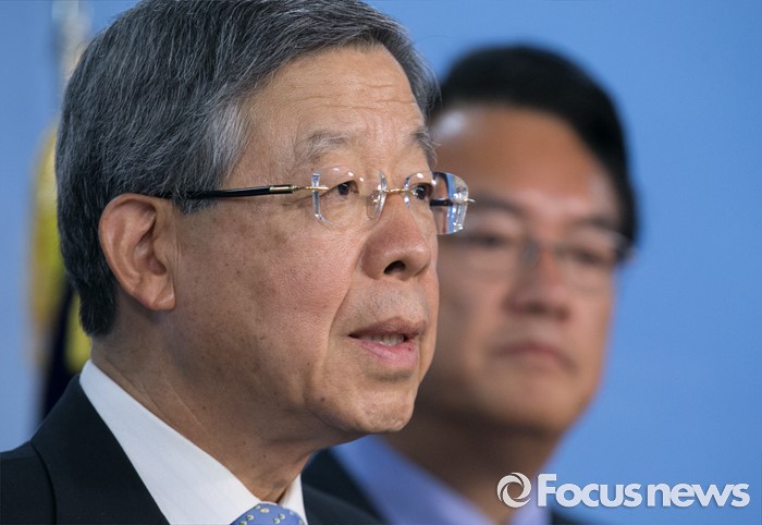 (서울=포커스뉴스) 새누리당 혁신비대위원장에 내정된 김희옥(왼쪽) 전 동국대 총장과 정진석 원내대표가 26일 오후 서울 여의도 국회 정론관에서 기자회견을 하고 있다.