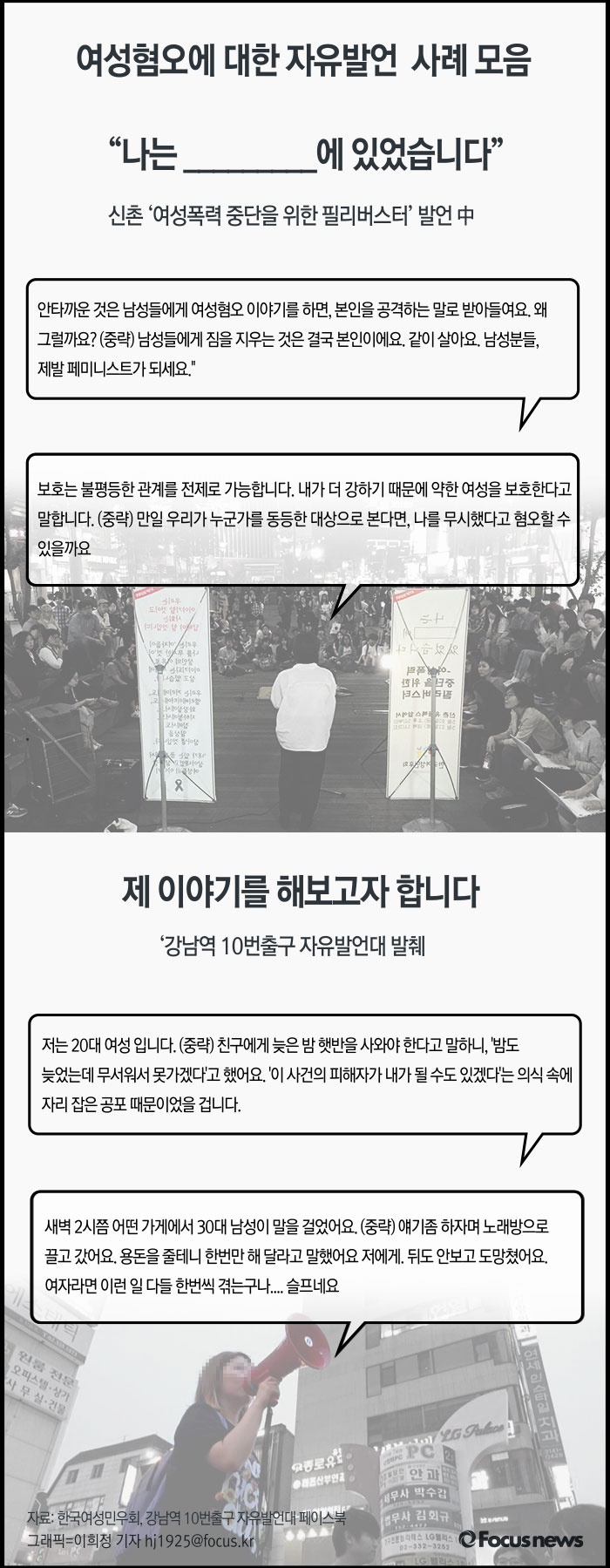 (서울=포커스뉴스) 지난 19일 오후 8시, 강남역 10번 출구에서 한국여성민우회가 '여성폭력 중단을 위한 필리버스터'를 주최했다. 여성들은 일상생활에서 겪었던 여성혐오 문제에 대한이야기들을 털어놓기 시작했다. 오프라인 뿐아니라 온라인에서는 지금도 많은 여성들의 이야기가 기록되고 있다.