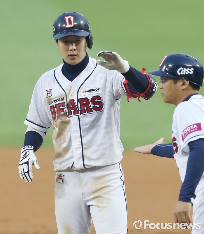 (서울=포커스뉴스) 26일 서울 잠실구장에서 열린 2016프로야구 kt-두산 경기 2회말 2사 1,3루에서 두산 박건우가 1타점 중전 안타를 치고 1루에서 강동우 코치와 손바닥을 마주치고 있다.