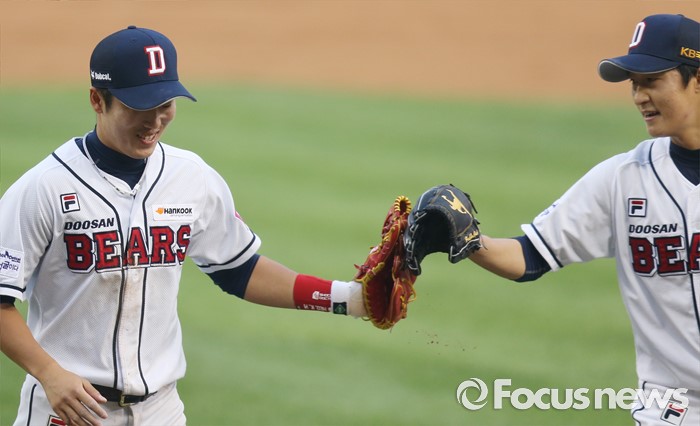 (서울=포커스뉴스) 26일 서울 잠실구장에서 열린 2016프로야구 kt-두산 경기 두산 투수 허준혁(오른쪽)이 2회초 수비를 마치고 나오며 kt 박기혁의 라인드라이브 타구를 다이빙 캐치한 3루수 허경민과 글러브를 마주치고 있다.