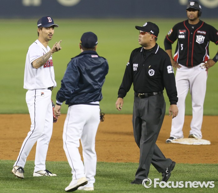 (서울=포커스뉴스) 26일 서울 잠실구장에서 열린 2016프로야구 kt-두산 경기 5회초 무사 1,2루에서 두산 김태형 감독이 kt 김상현의 유격수앞 땅볼때 1루주자 마르테를 포스아웃 시켰다고 항의하고 있다.