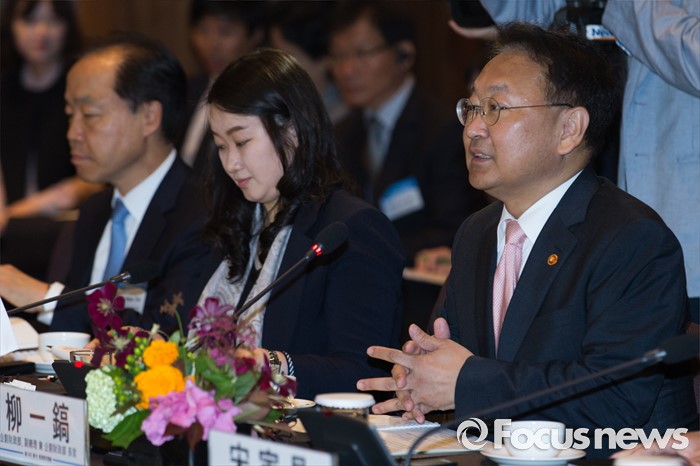 (서울=포커스뉴스) 유일호(오른쪽) 경제부총리 겸 기획재정부 장관이 27일 오전 서울 중구 신라호텔 영빈관에서 열린 제14차 한중경제장관회의에 참석해 개회사를 하고 있다.