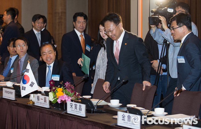 (서울=포커스뉴스) 유일호(왼쪽 세번째) 경제부총리 겸 기획재정부 장관이 27일 오전 서울 중구 신라호텔 영빈관에서 열린 제14차 한중경제장관회의에 참석하고 있다.