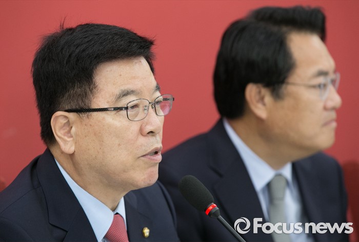 (서울=포커스뉴스) 김광림(왼쪽) 새누리당 정책위의장이 27일 오전 서울 여의도 국회에서 김희옥 혁신비대위원장 내정자와 원내지도부의 상견례 자리에 참석해 발언하고 있다.