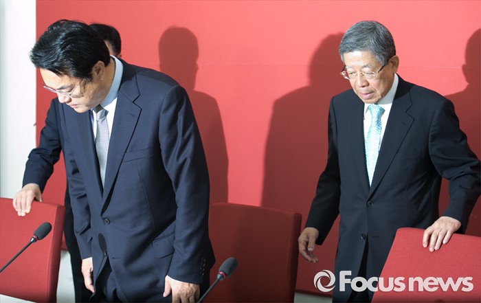 (서울=포커스뉴스) 정진석(왼쪽) 새누리당 원내대표와 김희옥 혁신비대위원장 내정자가 27일 오전 서울 여의도 국회에서 원내지도부와의 상견례 자리에 참석하고 있다.