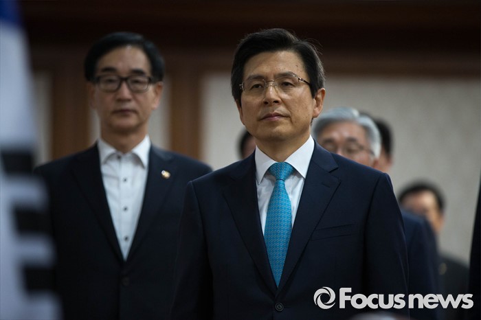 (서울=포커스뉴스) 27일 오전 서울 종로구 정부서울청사에서 열린 임시 국무회의에서 황교안 국무총리가 태극기를 바라보고 있다.