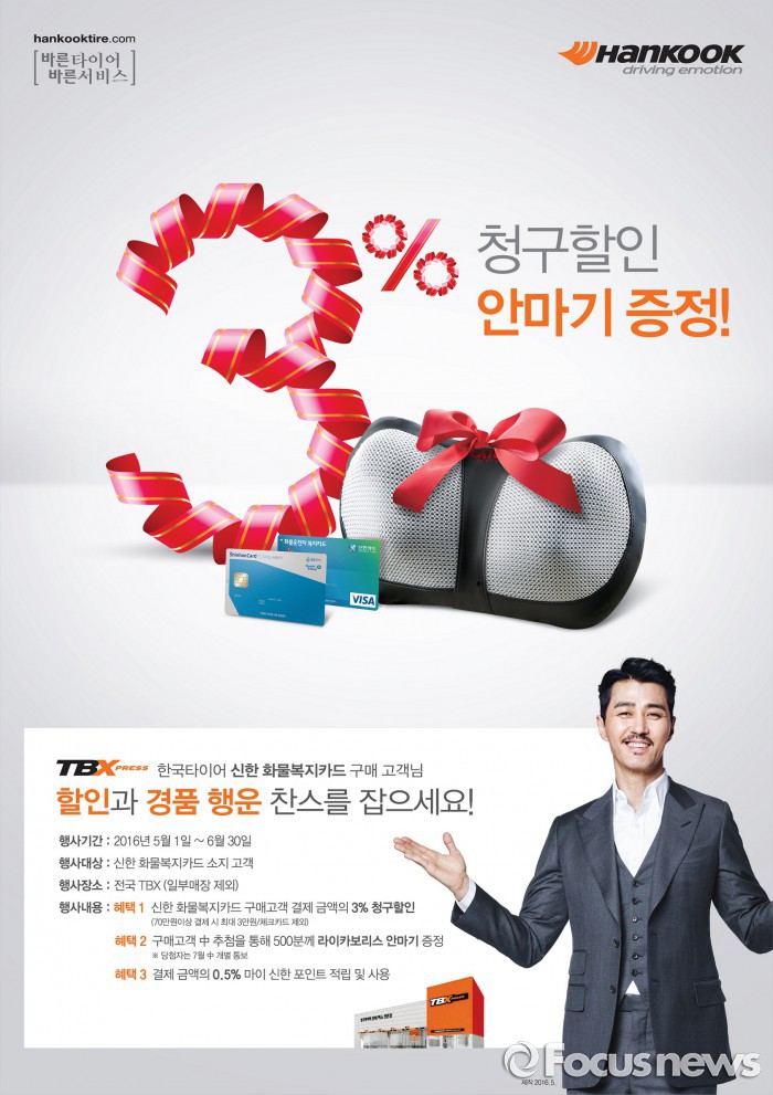 이번 이벤트는 신한 화물복지카드를 소지한 고객을 대상으로 전국 트럭버스 전문매장 TBX(Truck Bus Express)에서 진행되며, 트럭버스용 타이어 구매 시 결제 금액의 3%가 청구 할인된다.