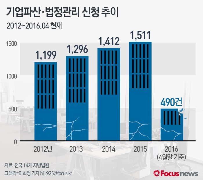 (서울=포커스뉴스) 국내 기업의 파산 및 법정관리 신청수가 지속적으로증가세를 보이고 있다. 2016년 4월말 기준 기업파산 및 법정관리 신청 수는 490건으로 지난해 같은기간 480건과 비교해 10건 증가했다.