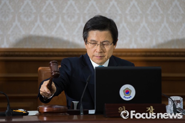 (서울=포커스뉴스) 27일 오전 서울 종로구 정부서울청사에서 열린 임시 국무회의에서 황교안 국무총리가 회의 시작을 알리며 의사봉을 두드리고 있다.