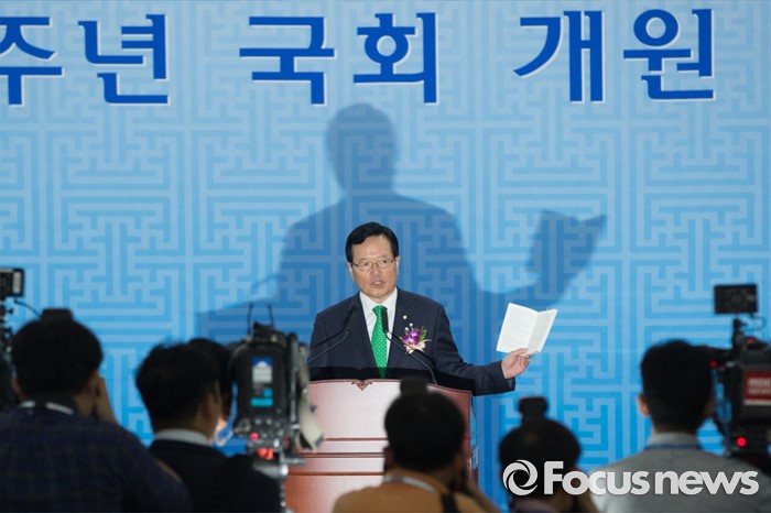 (서울=포커스뉴스) 정의화 국회의장이 27일 오전 서울 여의도 국회에서 열린 '제68주년 국회 개원 기념식'에 참석해 인사말을 하던 중 헌법-국회관계법 책을 손에 들고 국회법 개정안에 대해 대통령의 거부권 행사에 대한 입장을 전달하고 있다.