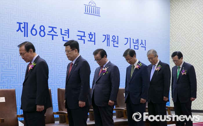 (서울=포커스뉴스) 27일 오전 서울 여의도 국회에서 열린 68주년 국회 개원 기념식에 참석한 노회찬(왼쪽부터) 정의당 원내대표, 김광림 새누리당 정책위의장, 정갑윤 국회 부의장, 천정배 국민의당 공동대표, 김종인 더불어민주당 비대위 대표, 정의화 국회의장 등 참석자들이 묵념을 하고 있다.