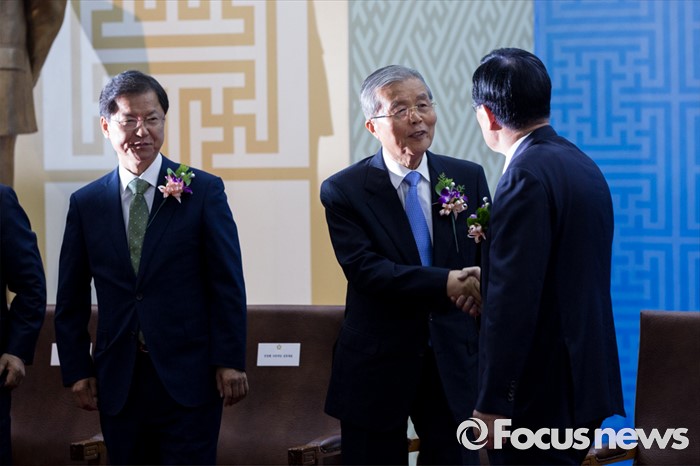 (서울=포커스뉴스) 정의화(오른쪽) 국회의장과 김종인(가운데) 더불어민주당 비상대책위 대표가 27일 오전 서울 여의도 국회에서 열린 '제68주년 국회 개원 기념식'에 참석해 악수하고 있다. 이날 정진석 새누리당 원내대표는 행사에 참석하지 않았다.