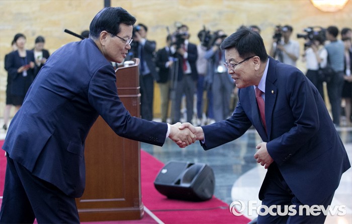 (서울=포커스뉴스) 27일 오전 서울 여의도 국회에서 열린 68주년 국회 개원 기념식에 참석한 정의화(왼쪽) 국회의장과 김광림 새누리당 정책위의장이 인사하고 있다.