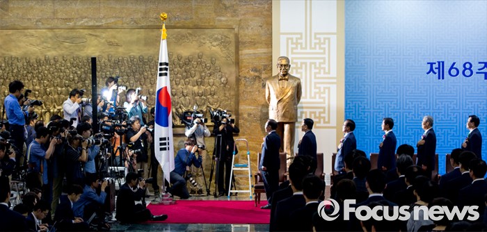 (서울=포커스뉴스) 정의화(오른쪽) 국회의장을 비롯한 여야 지도부가 27일 오전 서울 여의도 국회에서 열린 '제68주년 국회 개원 기념식'에 참석해 국민의례 하고 있다. 이날 정진석 새누리당 원내대표는 행사에 참석하지 않았다.