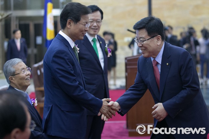 | △ 인사하는 여야 참석자들 |