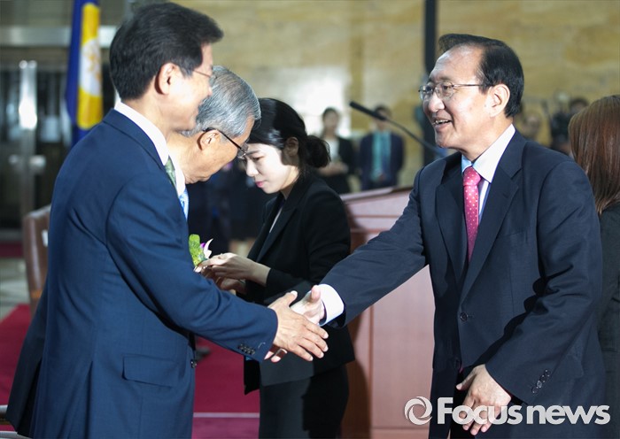(서울=포커스뉴스) 27일 오전 서울 여의도 국회에서 열린 68주년 국회 개원 기념식에 참석한 노회찬(오른쪽부터) 정의당 원내대표, 김종인 더불어민주당 비대위 대표, 천정배 국민의당 공동대표가 인사하고 있다.