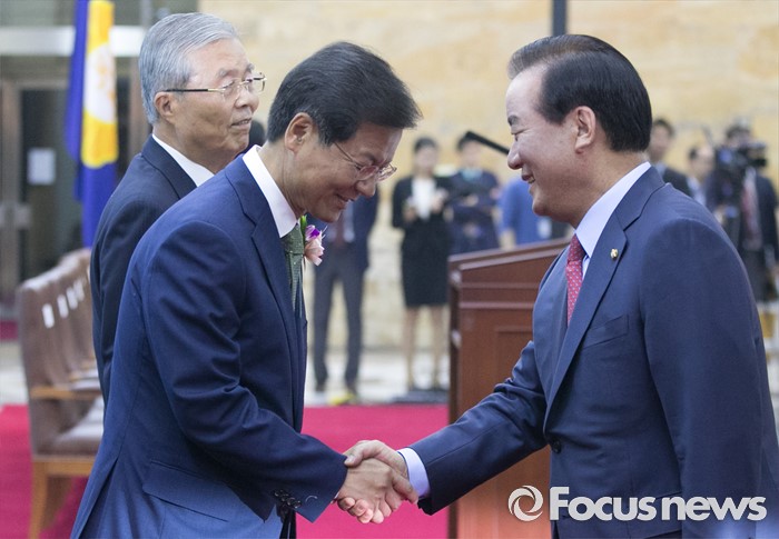 (서울=포커스뉴스) 27일 오전 서울 여의도 국회에서 열린 68주년 국회 개원 기념식에 참석한 정갑윤(오른쪽부터) 국회 부의장, 천정배 국민의당 공동대표, 김종인 더불어민주당 비대위 대표가 인사하고 있다.