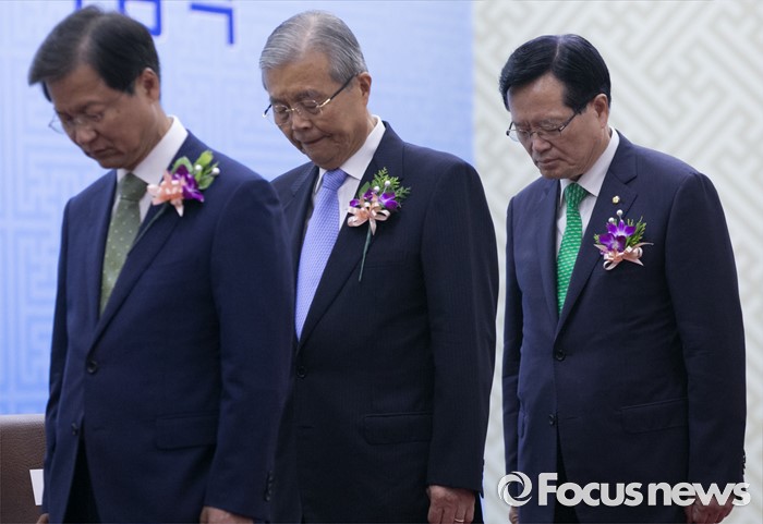 (서울=포커스뉴스) 27일 오전 서울 여의도 국회에서 열린 68주년 국회 개원 기념식에 참석한 천정배(왼쪽부터) 국민의당 공동대표, 김종인 더불어민주당 비대위 대표, 정의화 국회의장 등 참석자들이 묵념을 하고 있다.