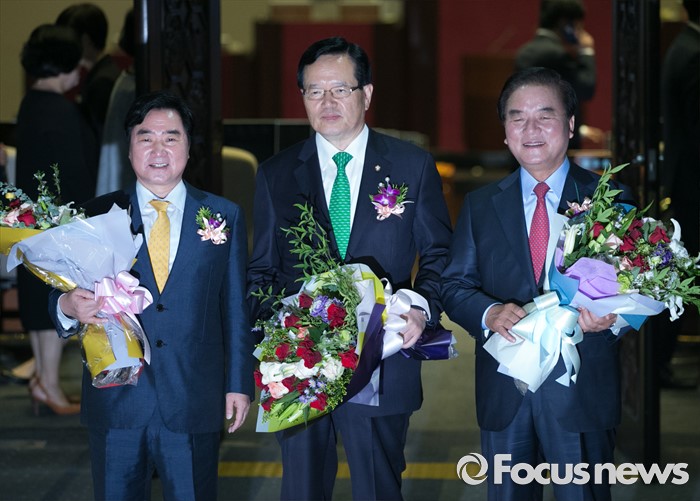(서울=포커스뉴스) 27일 오전 서울 여의도 국회에서 68주년 국회 개원 기념식을 마친 정의화(가운데) 국회의장이 본회의장에서 정갑윤(오른쪽), 이석현 국회 부의장 등 직원들과 함께 기념촬영 후 나서며 취재진을 향해 포즈를 취하고 있다.